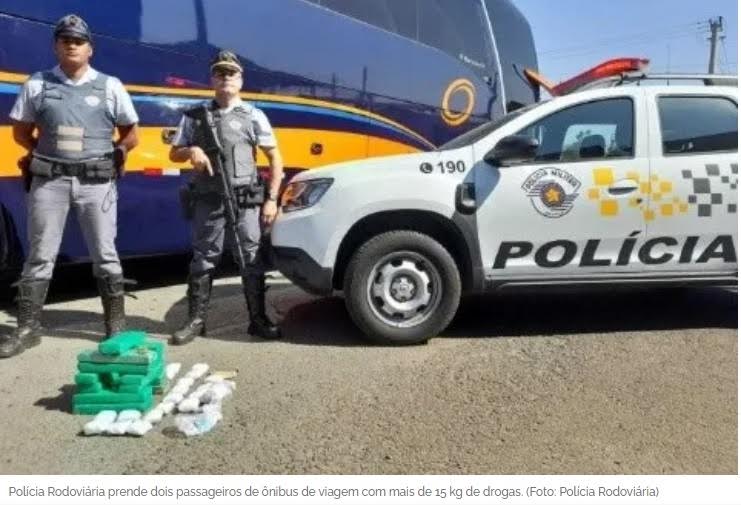 A Polícia Militar Rodoviária (PMR) efetuou a prisão de duas pessoas que foram flagradas com 15,6 kg de drogas( maconha, cocaína e crak) dentro de malas em um ônibus de viagem que trafegava pela Rodovia Anhanguera, em Pirassununga.