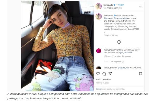 Também muito famosa em terras asiáticas e com três milhões de seguidores no Instagram, a conta @lilmiquela é o rosto de grandes marcas, como Prada e Nike, e um case publicitário. Criada há seis anos, Miquela tem DNA 100% digital, ou seja, só existe na internet, e se autodescreve como um robô de 19 anos vivendo em Los Angeles.