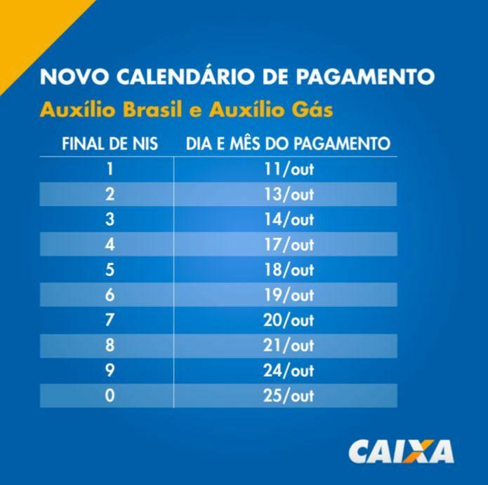 A CAIXA antecipará os pagamentos do Auxílio Brasil e do Auxílio Gás de outubro. Previstos inicialmente para o dia 18, os repasses vão começar na terça-feira, 11 de outubro, para os beneficiários com final de NIS 1.