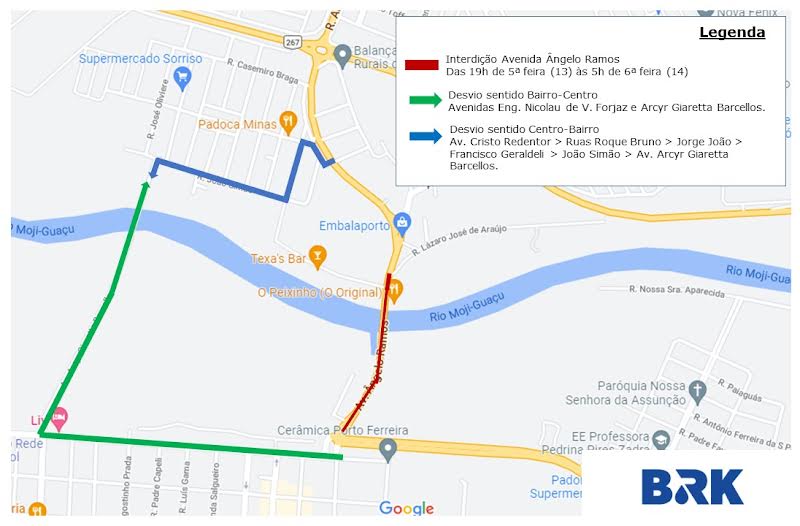 Para a execução dos serviços, o tráfego de veículos na avenida Ângelo Ramos será interditado nos dois sentidos da via, antes e após a ponte sobre o rio Mogi Guaçu.