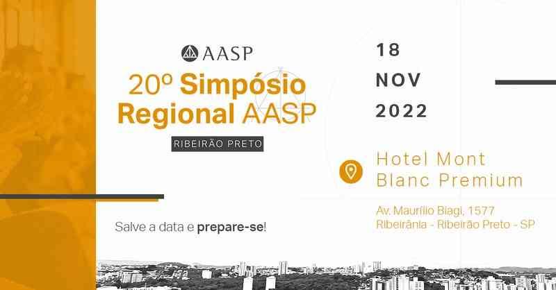 A Associação dos Advogados de São Paulo – AASP realiza no próximo dia 18 de novembro, a partir das 9h, o 20º Simpósio Regional AASP, em Ribeirão Preto (SP). Após dois anos, o evento será retomado no modelo presencial, no Hotel Mont Blanc Premium (Av. Maurílio Biagi, 1577, Ribeirânia, Ribeirão Preto, SP), com um dia inteiro dedicado às questões do universo jurídico.