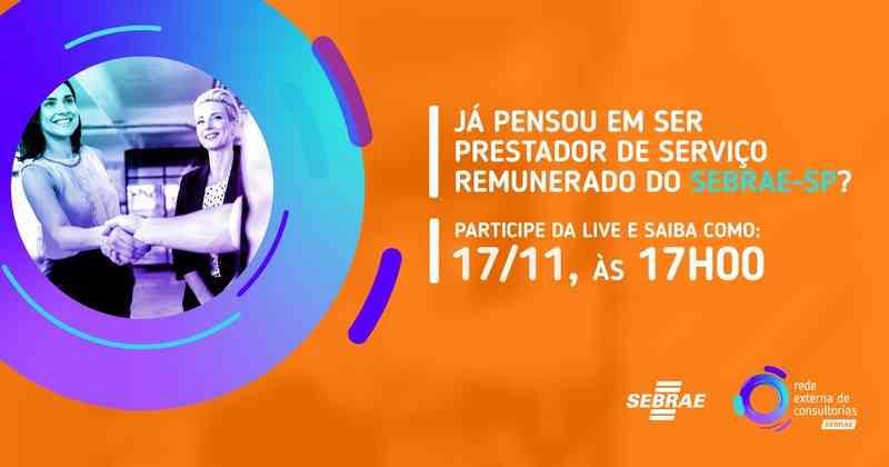 O Sebrae-SP realiza no dia 17 de novembro, às 17h, um encontro online para empreendedores que desejam saber mais sobre como ser fornecedor da instituição. Empresas de consultoria e treinamento que atuam em uma das 17 áreas de interesse podem prestar serviços em todo o estado de SP com remuneração de acordo com as horas trabalhadas.