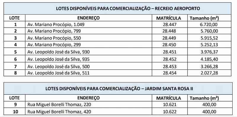 Ao todo serão oito áreas localizadas no Recreio Aeroporto e duas no Jardim Santa Rosa II, veja na imagem os lotes com suas respectivas áreas.