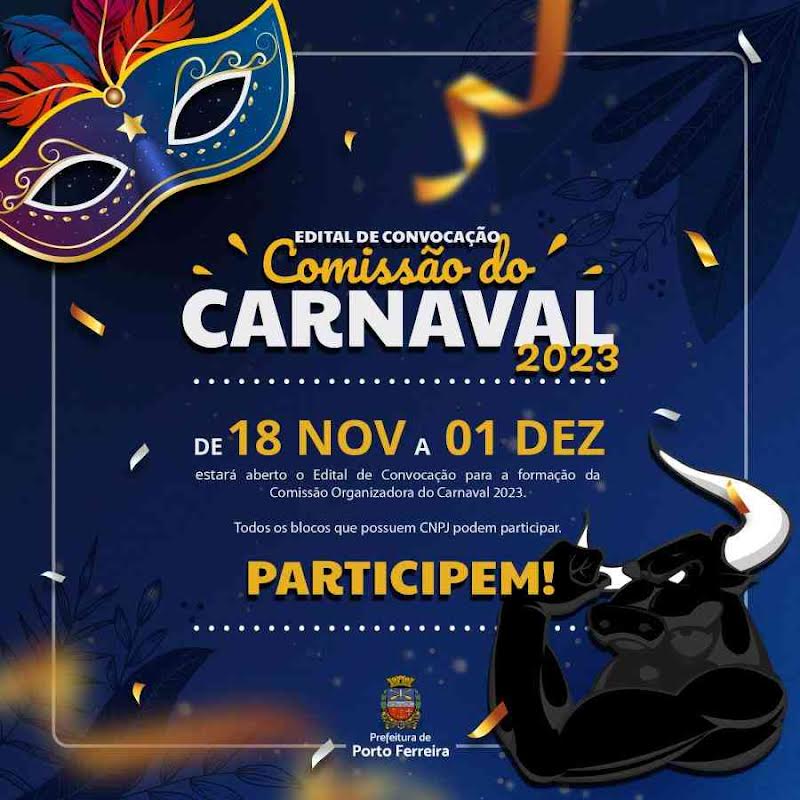 Nesta sexta-feira (18/11) a Secretaria de Cultura e Economia Criativa publica no diário oficial do município (Jornal do Porto) o Edital de Convocação da Comissão Organizadora do Carnaval 2023, que tem como objetivo oportunizar a participação dos blocos carnavalescos com seus representantes na Comissão organizadora do Carnaval de 2023.
