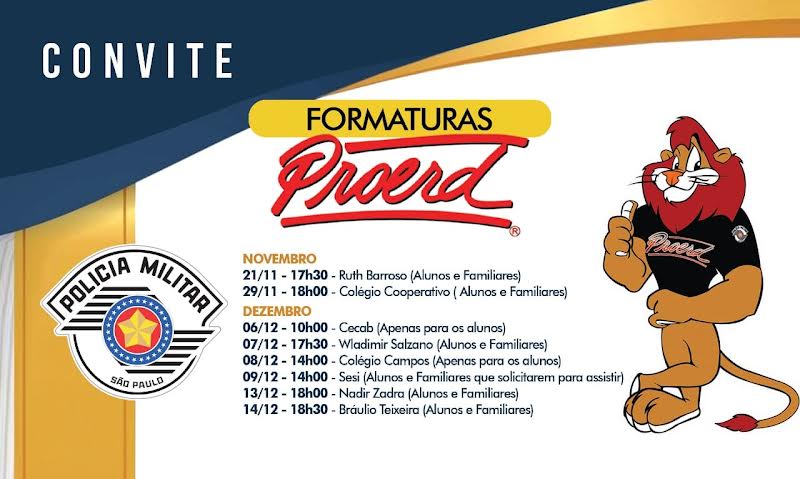 Terá início hoje, segunda-feira (21/10), as 17h30 na Emef Ruth Barroso no Bairro Porto Belo I, as formaturas das escolas onde os alunos dos 1º e 5º anos que participaram do segundo semestre do Programa Educacional de Resistência as Drogas e a Violência da Polícia Militar do Estado de São Paulo – Proerd.