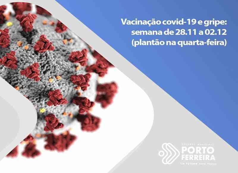 A Vigilância Epidemiológica de Porto Ferreira informa como vai ser o esquema de vacinação contra covid-19 e gripe (influenza) nesta semana, de segunda a sexta-feira (28/11 a 02/12), das 8h às 16h, para todos os públicos.Esta semana haverá plantão na quarta-feira (30/11), das 16h às 20h, na Vigilância Epidemiológica.