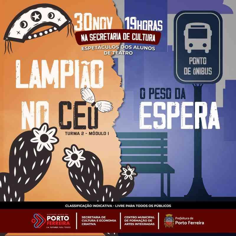 Nesta terça e quarta-feira (29 e 30/11) acontecem as apresentações das turmas de teatro do Centro Municipal de Formação de Artes Integradas, mantido pela Secretaria de Cultura e Economia Criativa de Porto Ferreira.
