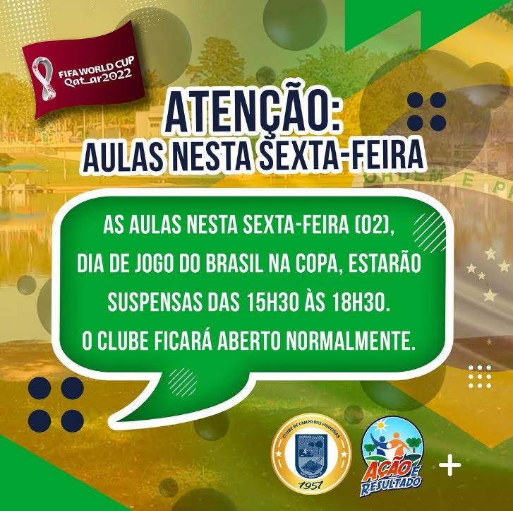 As Aulas nesta sexta-feira 02-12-2022, dia jogo do Brasil na Copa, estarão suspensas das 15h30 as 18h30.