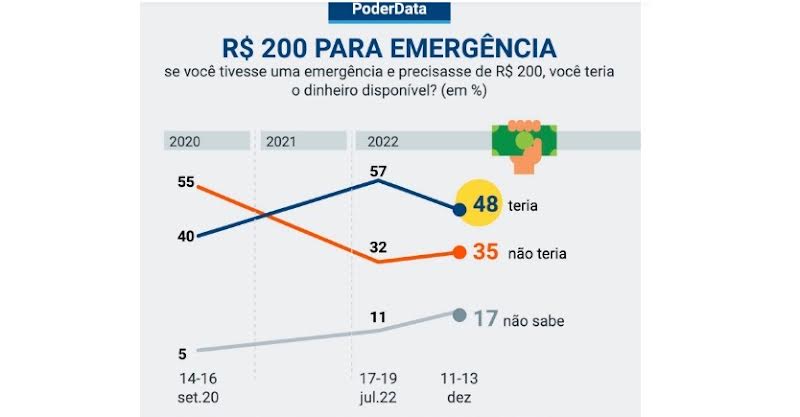 Perto de metade das pessoas com 16 anos ou mais não teria ou não sabe se teria R$ 200 guardados para usar em uma emergência. A informação vem de pesquisa PoderData realizada de 11 a 13 de dezembro de 2022.