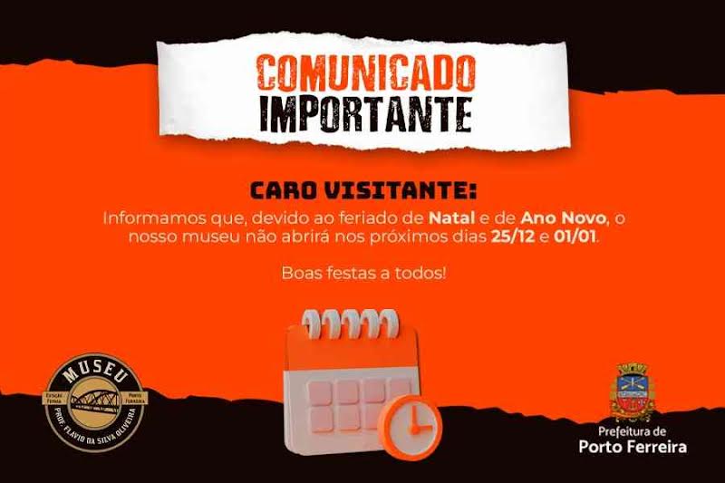 Seção de Preservação do Patrimônio Histórico, vinculada à Secretaria de Cultura e Economia Criativa de Porto Ferreira, informa que o Museu Professor Flávio da Silva Oliveira não terá expediente no próximo sábado, dia 31 de dezembro e no domingo, 1º de Janeiro.