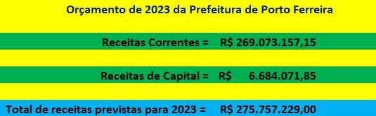 Aprovado pela Câmara Municipal e objeto da Lei nº 3.701, sancionada e promulgada pelo prefeito Rômulo Rippa, o orçamento da Prefeitura Municipal de Porto Ferreira para 2023 estima Receita no valor de R$ 275.757.229,00; sendo R$ 202.366.584,07 do Orçamento Fiscal e R$ 73.390.644,93 do Orçamento da Seguridade Social.