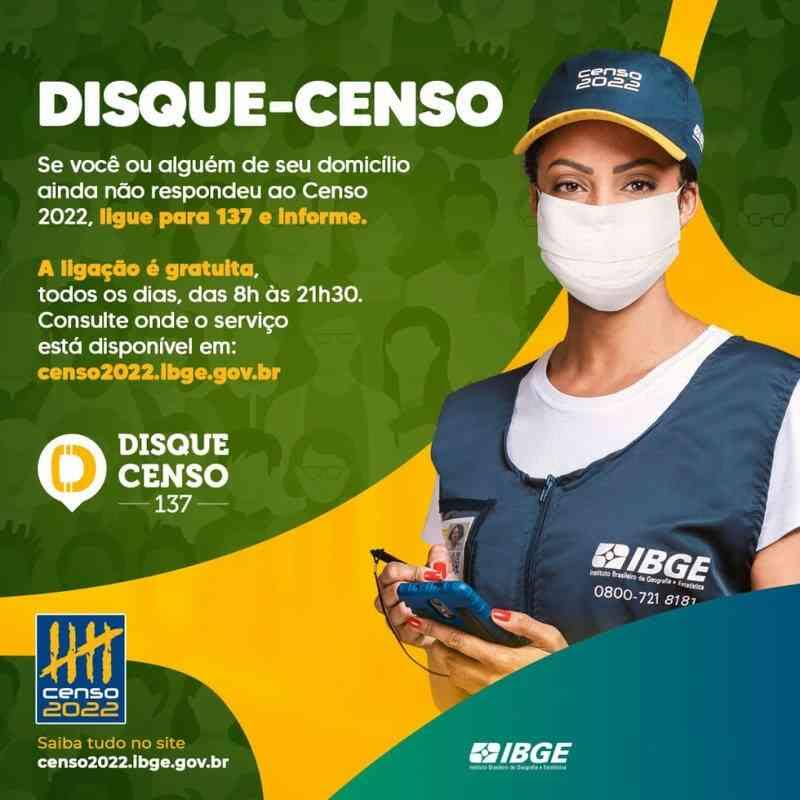 Consulte neste link mais informações sobre o Disque Censo: https://censo2022.ibge.gov.br/pecas-de-divulgacao/disque-censo.html
