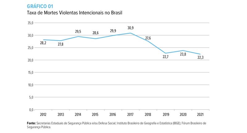 Em 2017, o Brasil bateu o recorde na taxa de mortes violentas intencionais (MVI), ou crimes violentos letais intencionais (CVLI), segundo o Anuário de Segurança Pública Brasileiro, com uma média de 30,9 mortes a cada 100 mil habitantes. No entanto, desde 2018, a média desse tipo de morte vem caindo no país. Em 2021, segundo dados do Anuário, a taxa caiu para 22,3 mortes a cada 100 mil habitantes.