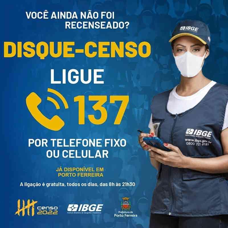 Este é mais um instrumento do IBGE para garantir a total cobertura censitária da população brasileira. Para participar, basta discar o número "137" e agendar a entrevista. A ligação é gratuita e estará disponível até o final do mês de janeiro de 2023. O horário de funcionamento do "Disque Censo" é de segunda a domingo, das 8h às 21h30.