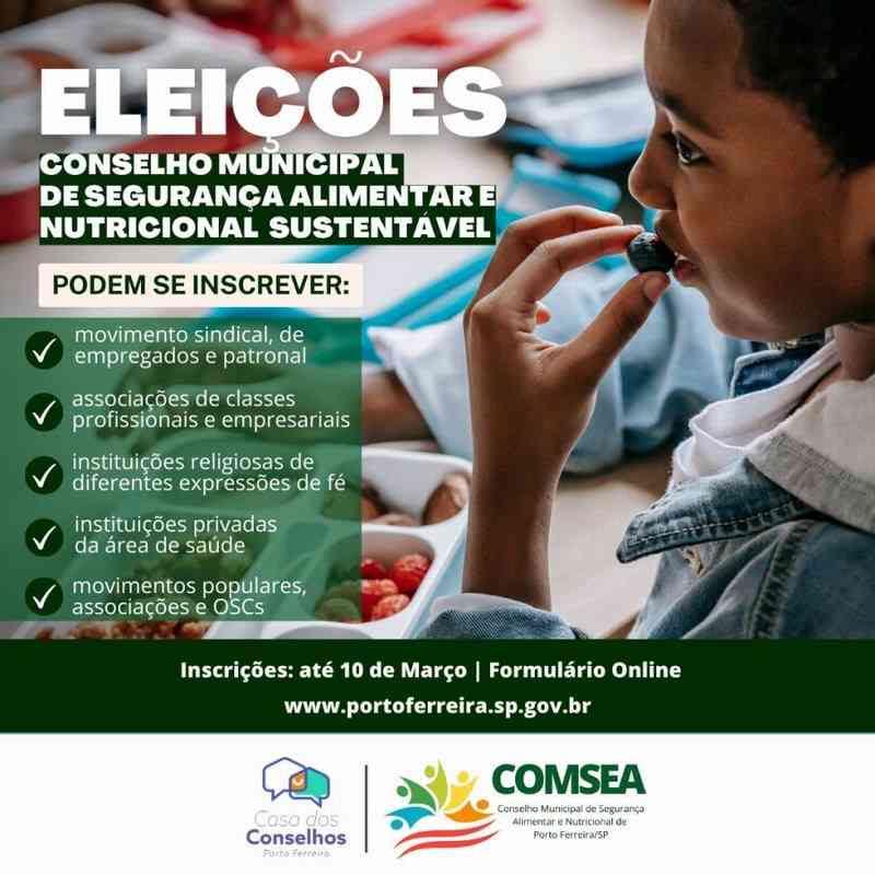 O Conselho Municipal de Segurança Alimentar e Nutricional Sustentável (Comsea) de Porto Ferreira está realizando o processo eleitoral para a composição da gestão 2023 a 2025. Podem se candidatar representantes de movimento sindical, de empregados e patronal, urbano e rural, de associações de classes profissionais e empresariais, de instituições religiosas de diferentes expressões de fé, de instituições privadas da área de saúde, de movimentos populares organizados, associações comunitárias e OSCs, conforme Lei Municipal nº 3487, de 2019.