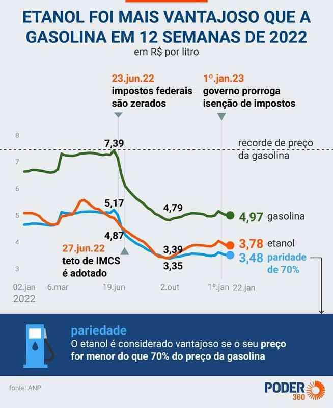 O etanol hidratado foi menos competitivo do que a gasolina em 332 dos 338 municípios pesquisados pela ANP (Agência Nacional de Petróleo, Gás Natural e Biocombustíveis) na última semana, segundo dados compilados pelo Poder360. Os 2 combustíveis competem no segmento de carros flex.