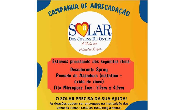 O Solar dos Jovens de Ontem está com uma campanha de arrecadar doaçõespara a instituição. Quem quiser contribuir, pode ligar no telefone (19) 3581-2586 para obter mais informações e presencialmente direto no endereço Rua João Colussi, 307.