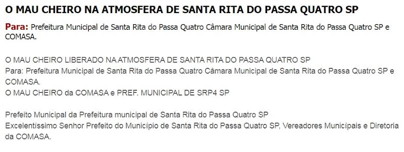 Populares do município de Santa Rita do Passa Quatro(SP) estão fazendo uma Petição Pùblica, através da Internet, questionando as autoridades municipais em especial o prefeito e os vereadores sobre o mau cheio reinante na cidade.
