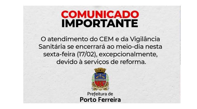 O atendimento do CEM e da Vigilância Sanitária se encerrará ao meio-dia nesta sexta-feira (17/02), excepcionalmente, devido à serviços de reforma.