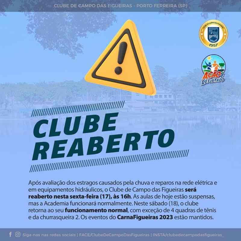 Após avaliação dos estragos causados pela chuva e reparos na rede elétrica e em equipamentos hidráulicos, o Clube de Campo das Figueiras será reaberto nesta sexta-feira (17), às 16h. As aulas de hoje estão suspensas, mas a Academia funcionará normalmente. Neste sábado (18), o clube retorna ao seu funcionamento normal, com exceção de 4 quadras de tênis e da churrasqueira 2.