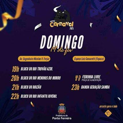 Confira horários e blocos que participarão do Carnaval 2023 em Porto Ferreira neste domingo, 19 de fevereiro: