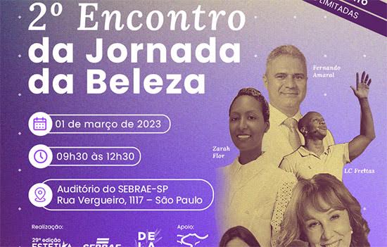 Para celebrar o início do Mês da Mulher, São Paulo recebe o 2º Encontro da Jornada da Beleza no dia 1º de março. O encontro gratuito e com vagas limitadas é realizado pelo Estetika, evento mais importante de estética, saúde, beleza e bem-estar da América Latina, em parceria com o Sebrae-SP e o Sebrae Delas SP. Para se inscrever, basta preencher o formulário.