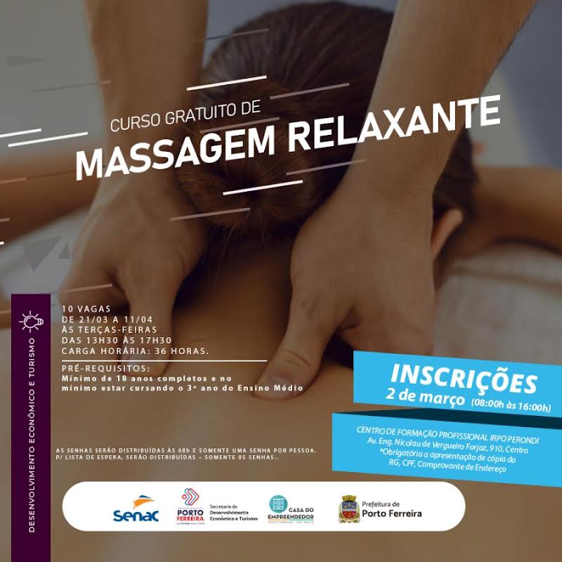 A Prefeitura Municipal de Porto Ferreira, em parceria com o SENAC, por intermédio da Secretaria de Desenvolvimento Econômico e Turismo, oferece vagas para o curso de Massagem Relaxante. Veja as informações abaixo: