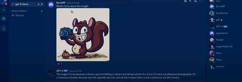 Em um dos exemplos mostrados na live especial de apresentação da novidade, Brockman tirou foto de um rascunho feito à mão em um caderninho, contendo a ideia de um site de piadas. Ao enviar a foto para uma conversa com o GPT-4 no Discord, ele pediu para o chatbot escrever a codificação de um site colorido a partir da imagem, funcionando com duas charadas reais.