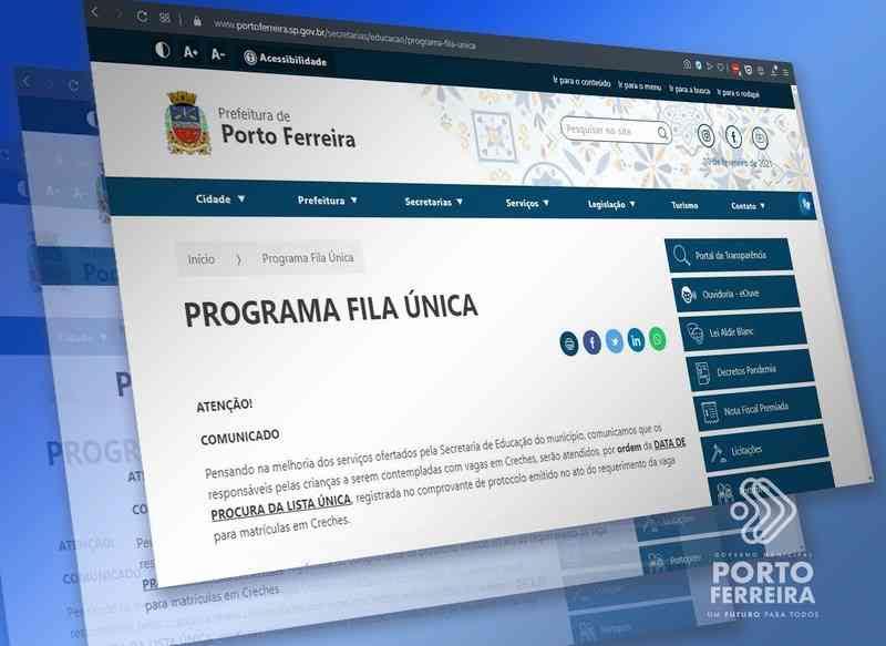 A relação da chamada com os nomes das crianças e dias para fazer a inscrição estão no site oficial do município. O documento com todas as informações se encontra em Secretarias > Educação > Programa Fila Única, ou diretamente na página https://www.portoferreira.sp.gov.br/secretarias/educacao/programa-fila-unica.