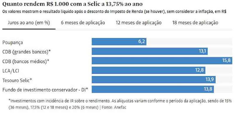 Segundo levantamento realizado por Storfer, ante o nível vigente da Selic, um investimento de R$ 1.000 no título público pós-fixado Tesouro Selic, que acompanha de perto a rentabilidade da taxa básica de juros, renderia ao aplicador R$ 114,96, considerado um intervalo de 12 meses. Veja na imagem do topo da reportagem uma simulação de quanto renderia por um ano um investimento de R$ 1.000 na poupança, CDB e Tesouro com a Selic a 13,75%.