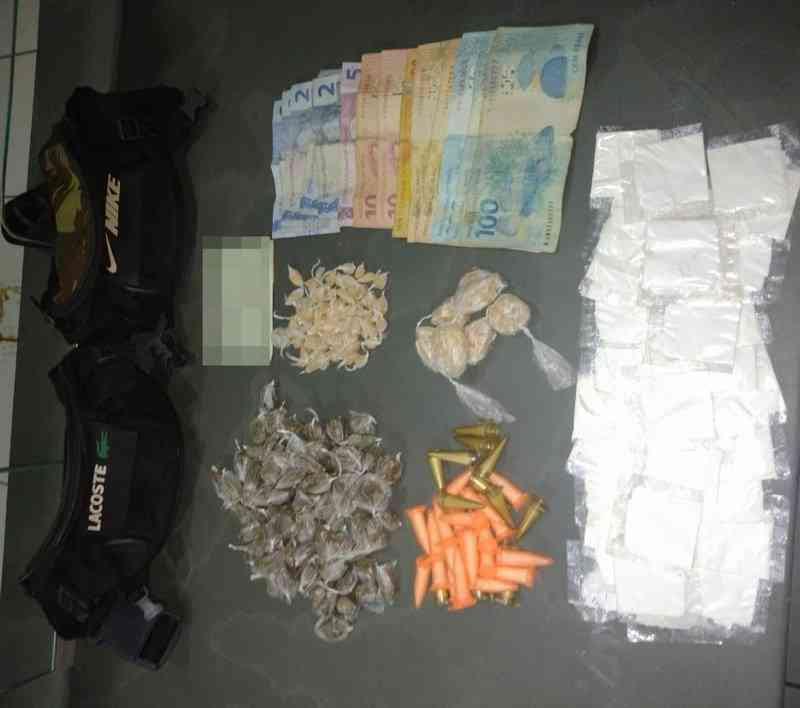 O menor foi abordado, sendo localizada próxima a ele uma sacola plástica contendo 153 Pedras de crack, 94 porções de maconha, 37 enppendorfs contendo cocaína e 42 sachês contendo cocaína.