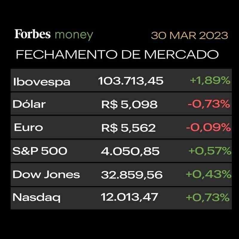 Nesta quinta-feira (30), o Ibovespa teve uma alta de 1,89% a 103.713,45 pontos, totalizando um volume financeiro de R$ 23,8 bilhões. Sendo a quinta alta consecutiva. Também pela quinta sessão consecutiva, o dólar caiu frente ao real. A moeda norte-americana recuou 0,76%, a R$ 5,0952.