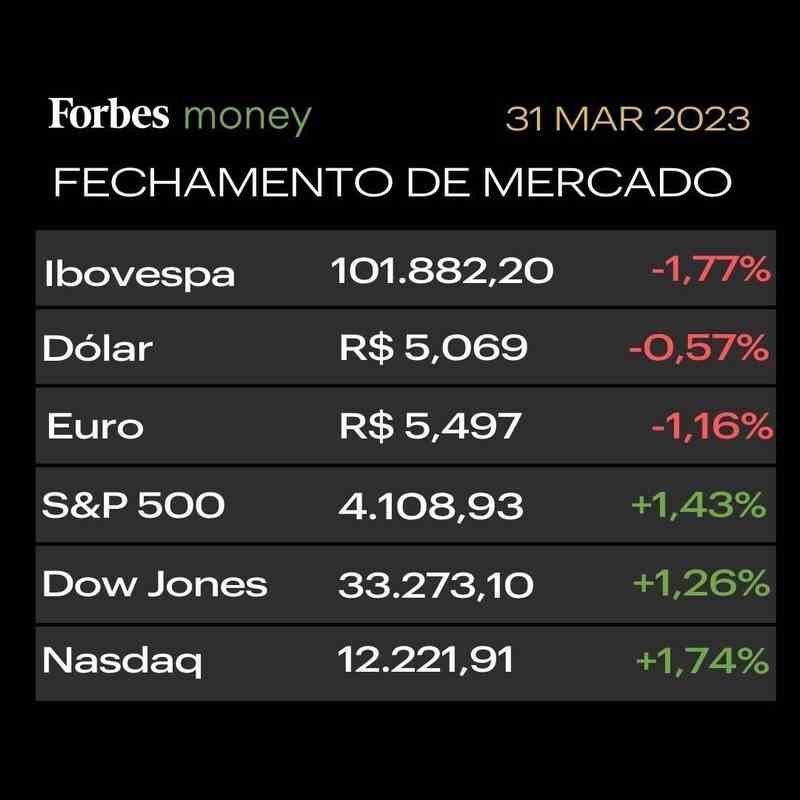 O Ibovespa fechou em queda de 1,77% nesta sexta-feira (31), aos 101.882,2. Na semana, o índice de referência brasileiro mostra desempenho positivo de 3,11%, mas registra queda de 1,16% no balanço do mês.