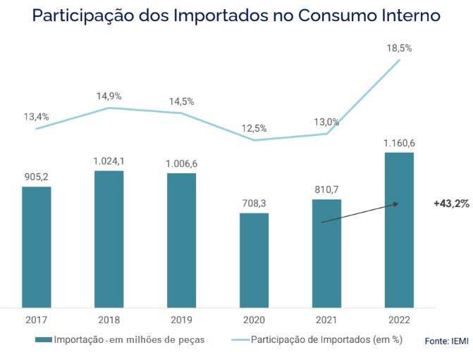 No ano passado, foram importadas 1,16 bilhão de peças, 43,5% mais do que em 2021 (810,7 milhões), de acordo com o levantamento. Na comparação com 2017, o salto é de 28,2%. Vale lembrar que as importações feitas por meio da plataforma chinesa, de acordo com Marcelo Prado, diretor do IEMI, não estão consideradas nos percentuais do estudo.