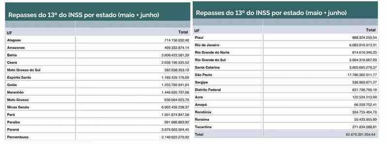 São Paulo é o estado que receberá o maior repasse para pagamento do abono anual levando em conta os dois meses de pagamento. Serão R$ 17,7 bilhões em recursos. Na sequência aparece Minas Gerais, com R$ 6,9 bilhões em repasses, seguido pelo Rio de Janeiro (R$ 6 bilhões), Rio Grande do Sul (R$ 5 bilhões), Paraná (R$ 3,67 bilhões) e Bahia (R$ 3,6 bilhões). Confira na imagem da reportagem a tabela completa