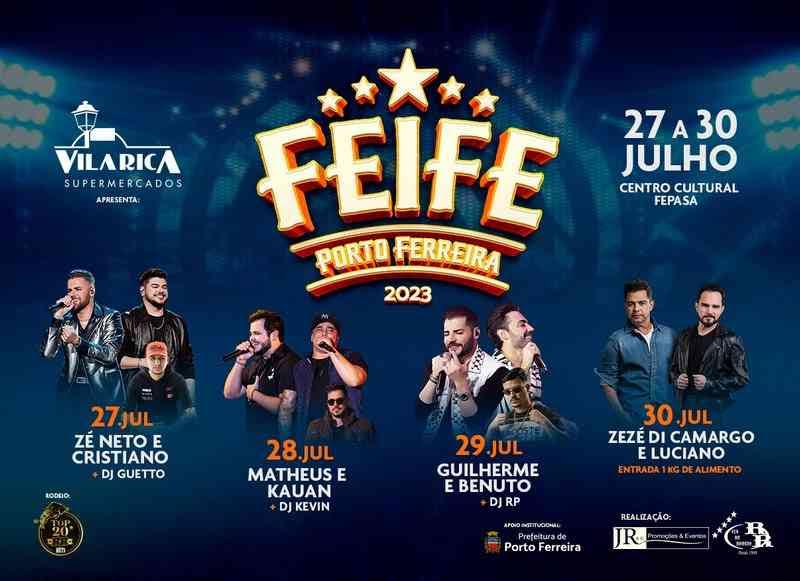 O site da Prefeitura de Porto Ferreira publicou oficialmente nesta sexta-feira as atrações artísticas da Feife 2023, com shows 100% sertanejo. O evento acontece na área da antiga Fepasa entre os dias 27 e 30 de julho.