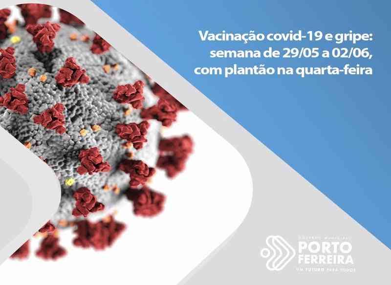 A Vigilância Epidemiológica de Porto Ferreira informa como vai ser o esquema de vacinação contra covid-19 e gripe nesta semana, de segunda a sexta-feira (29/05 a 02/06). O horário é das 8h às 16h.