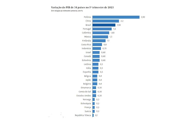 * Confira na imagem do topo da reportagem o o crescimento do PIB de diversos países no 1º trimestre de 2023