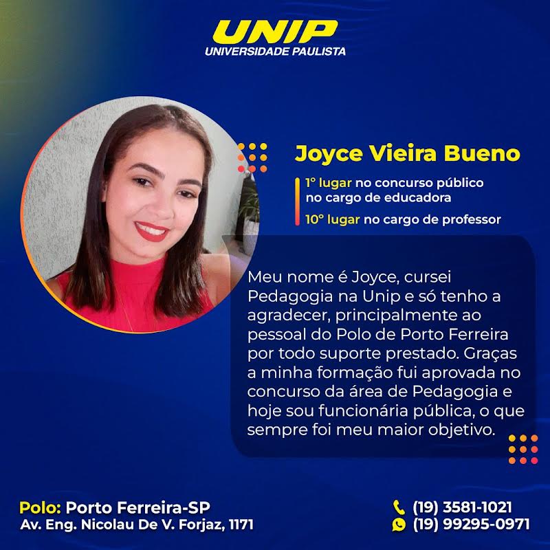 "Meu nome é Joyce, cursei Pedagogia na Unip e só tenho a agradecer, principalmente ao pessoal do Polo Porto Ferreira por todo o suporte prestado. Graças a minha formação fui aprovada no concurso da área de Pedagogia e hoje sou funcionária pública, o que sempre foi meu maior objetivo."