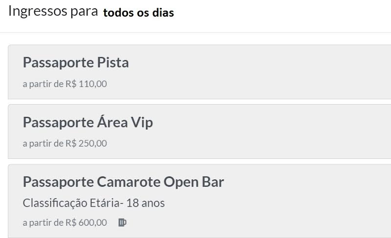 Os ingressos estão disponíveis on line, por meio deste link, sendo possível adquirir o passaporte ou o dia e artista de sua preferência. Sendo passaporte pista a partir de R$ 110,00; Passaporte área Vip a partir de R$ 250,00; Passaporte Open Bar a partir de R$ 600,00. Valores dos ingressos para um dia são respectivamente: a partir de R$ 30,00; R$ 80,00 e R$ 180,00