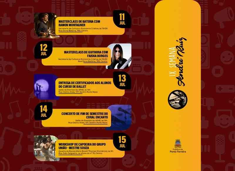 A Secretaria de Cultura e Economia Criativa de Porto Ferreira divulga a programação completa da IX Semana Cultural André Ruiz, que acontece de terça-feira a sábado (11 a 15/07), com diversos eventos.
