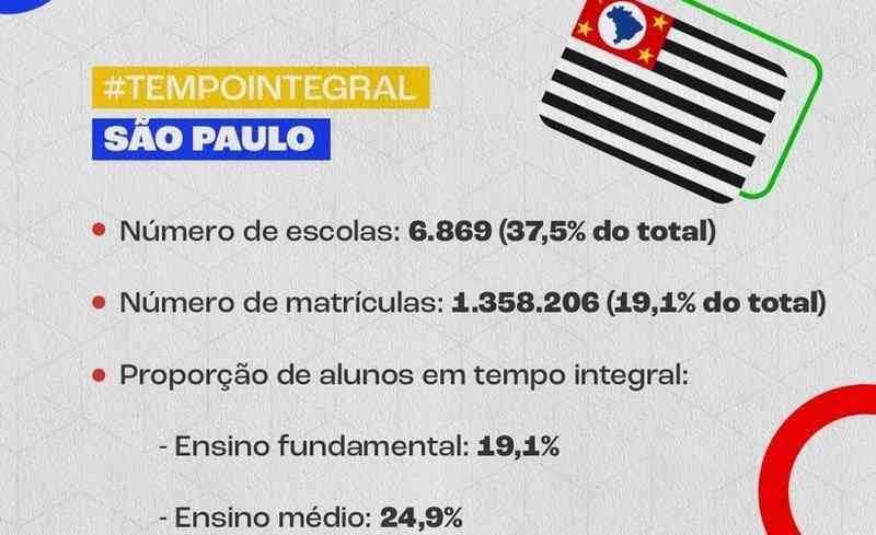 O estado de São Paulo conta com 6.869 escolas em tempo integral, de acordo com a primeira etapa do Censo Escolar 2022, divulgada em fevereiro pelo Instituto Nacional de Estudos e Pesquisas Educacionais Anísio Teixeira (Inep). Isso representa, em relação ao total das escolas públicas no estado, 37,5%. Essas instituições em tempo integral realizaram 1,35 milhão de matrículas (19,1% do total).