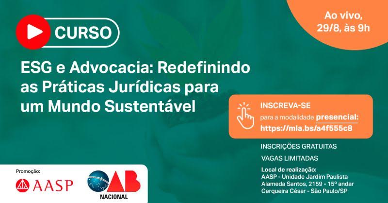 A AASP – Associação dos Advogados, em parceria com a Comissão Nacional de Relações Internacionais da Ordem dos Advogados do Brasil (OAB Nacional), realiza o curso gratuito “ESG e Advocacia: Redefinindo as Práticas Jurídicas para um Mundo Sustentável”, em 29 de agosto, terça-feira. A agenda será realizada na unidade Jardim Paulista da AASP, localizada na Alameda Santos, 2159 – 15º andar, Cerqueira César, São Paulo/SP, com início às 9h (horário de Brasília-DF).
