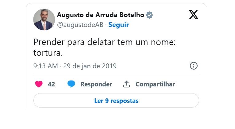 Um tuíte de 2019 do atual secretário Nacional de Justiça, Augusto de Arruda Botelho, no qual ele afirma que prender para delatar seria tortura, voltou a circular em redes socais após o ministro Alexandre de Moraes (STF) homologar o acordo de delação de Mauro Cid, ex-ajudante de ordens do ex-presidente Jair Bolsonaro (PL).