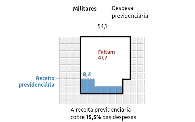 Segundo o economista, a receita anual para a Previdência dos militares cobre cerca e 15,5% do total das despesas com benefícios. A diferença cai na conta do Tesouro Nacional. Como o dinheiro vem dos impostos, Drumond explica que é como se todos os brasileiros arcassem com a despesa para cobrir o que falta.