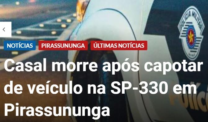 O casal Sebastião Vicente Filho, 69, Iraci Maria dos Santos Vicente, 66, vieram a óbito no sábado, 9 de setembro, no Pronto Socorro de Pirassununga, depois de terem sido socorridos em estado grave, devido a capotagem do veículo VW/Gol placas de São Paulo. O filho do casal, Pedro Henrique, 24, também foi socorrido.