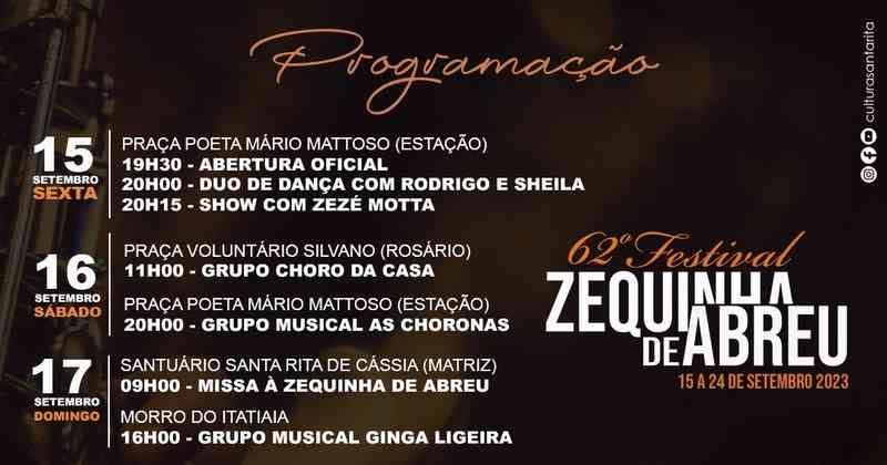 Começa nesta sexta-feira (15/09) em Santa Rita do Passa Quatro, o 62º Festival Zequinha de Abreu, promovido pela Prefeitura Municipal por meio do Departamento de Turismo, Cultura, Esporte e Lazer.