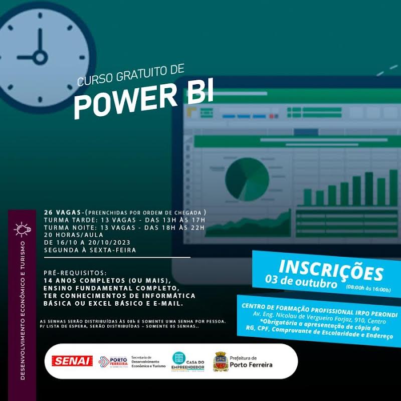 A Prefeitura de Porto Ferreira, em parceria com o Senai (Serviço Nacional de Aprendizagem Industrial), por intermédio da Secretaria de Desenvolvimento Econômico e Turismo, oferece vagas para o curso de POWER BI.