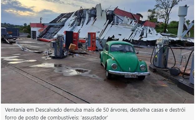 A ventania em Descalvado (SP) derrubou mais de 50 árvores, deixou bairros sem energia elétrica e destelhou casas na noite de segunda-feira (16). O forro de um posto de combustíveis ficou destruído. Apesar do susto, ninguém ficou ferido, segundo o Corpo de Bombeiros.