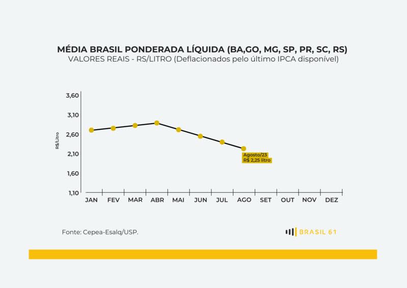 O valor médio do litro pago ao produtor está em R$ 2,25 na “Média Brasil” no final de setembro. O que é 29,4% menor do que o preço pago aos produtores no mesmo período do ano passado e representa uma queda real acumulada de 13,6% desde o início de 2023. Os dados são do Cepea (Centro de Estudos Avançados em Economia Aplicada), da Esalq/USP.
